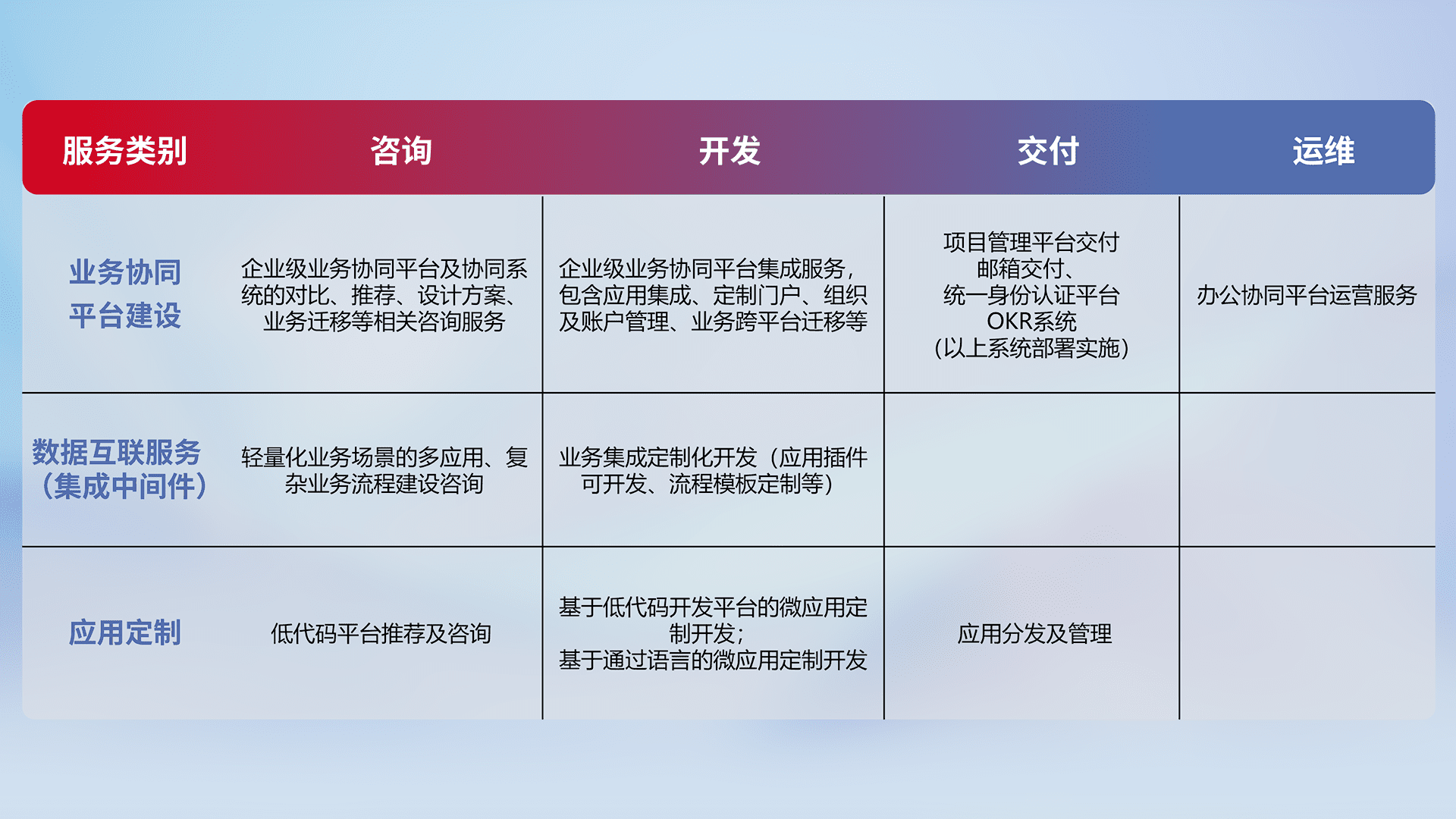 针对钉钉、、、、企微、、IDaas等平台级产品提供产品的规划、、、、方案、、交付、、、定制化开发等服务,,,,实现如统一协同办公、、、智能客户服务、、、、混合会议管理、、智能数据查询、、、等业务场景,,,实现数字化转型。。。。